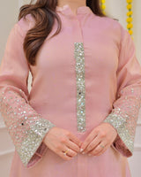Celebrate the joy of festivities in style with this baby pink tissue silk Kurta Set. Designed with premium lining for a comfortable fit and elevated with intricate hand embroidery, it’s an ensemble that balances sophistication with festive sparkle.