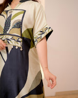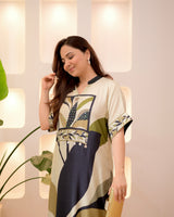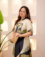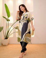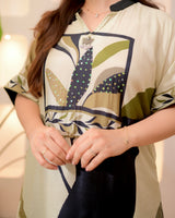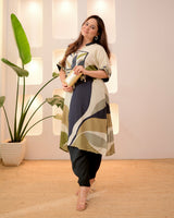 Celebrate Rakhi in this effortless fusion look – Kaftan-style top with a flared dhoti bottom, crafted in pure Muslin with sequin handwork and dreamy floral prints.