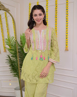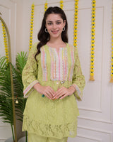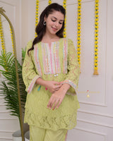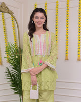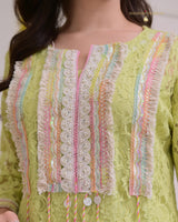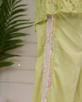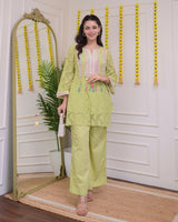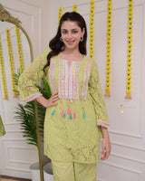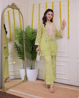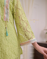 Wrap yourself in elegance this Festive with our Green Coord Set, featuring intricate Schiffli embroidery, tassels and pearl accents.