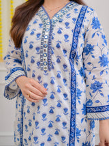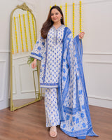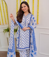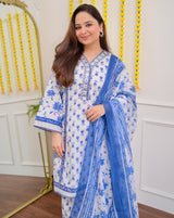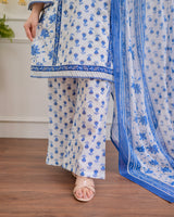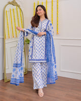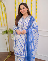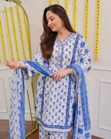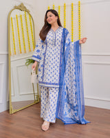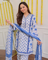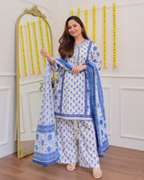 This season, let your wardrobe bloom with sophistication. Our finely tailored cotton suits features an artistically crafted short kurta with intricate floral motifs and lacework, complemented by the elegance of a comfort fit salwar and coordinating dupatta.