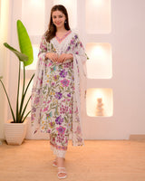 A blend of tradition, modernity and comfort. Tradition and style in perfect harmony. It is paired with matching cotton pants and printed cotton dupatta.