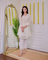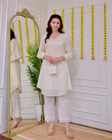 Wrap yourself in elegance this season with our Ivory Coord Set, featuring intricate Schiffli embroidery and hand embroidery details.