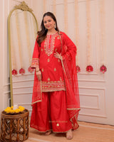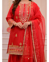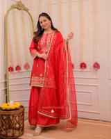Featuring Red Chanderi Silk Sharara Set with slitted straight Kurta, having intricate Gota work, Gota embroidery and Dori work on the Yoke, front Bottom, and Sleeves, with a round neckline, and a placket with hook and eye closure, enhanced with show Buttons.
