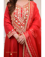 This design features a matching Organza Dupatta, Embellished with Zari-Sequin Lace and Gota on the border.
