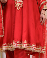 The short Anarkali kurta features intricate Gota Patti Embroidery on the yoke, bottom, and sleeve edges, featuring a Kalidaar flared silhouette, sweetheart neckline, and show buttons on the yoke. It is paired with matching solid Salwar adorned with Gota detail at the bottom, and an elasticated Waistband with a drawstring closure for a personalized fit.