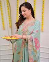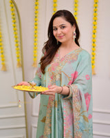 Celebrate the festive season in style with our Sea Green Hand Embroidered Sharara set, adorned with Finest Gota Hand Embroidery and Beautiful Floral Prints All Over.
