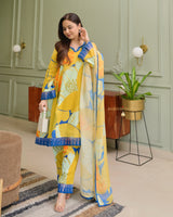 Embrace elegance with our Mustard-Blue floral Suit Set featuring a gracefully printed A-line kurta. The has very beautiful neckline, while tonal lace detailing adds a touch of sophistication to the neckline, sleeves, and pant hemline. The pants, with an elasticated back and drawstring, ensure comfort and style effortlessly blend. Complete with convenient silhouette this set exudes timeless charm for every occasion.
