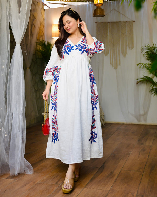 Ivory Bohemian Petals Threaded Cotton A Line Dress