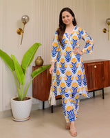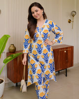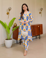 Embrace elegance with our Floral Premium Cotton Co-ords featuring a gracefully printed A-line kurta and straight pants. It has very beautiful neckline which adds a touch of sophistication.