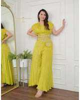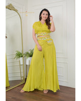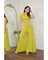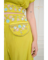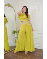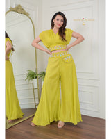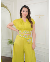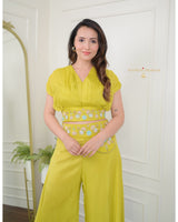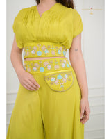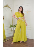Chase the style goal in this delightful yellow chinnon co-ord set. This two piece set includes a crop top with a small handwork bag and flared pants.