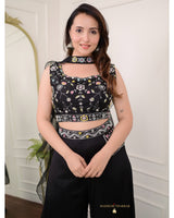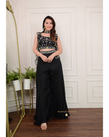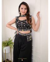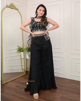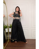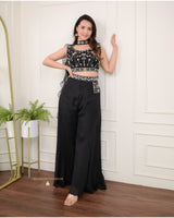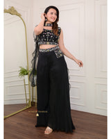 Chase the style goal in this delightful Black Sharara Set. Essential for cocktail nights and other wedding affairs. You can dance freely in this comfortable yet elegant Sharara Set. It is crafted with finest hand embroidery all-over.