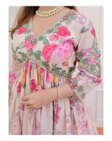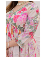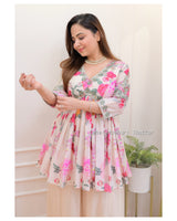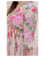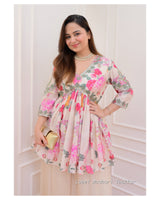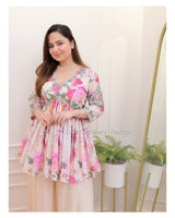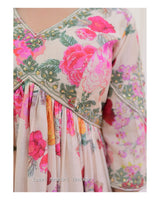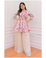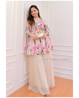 Glam up your festive wardrobe with our newly lunched collection. Featuring off white cotton silk peplum with sage green resham dori work with petal leaves motif, highlighted with sequins, moti, cutdana, thread work butta on sleeves and hand embroidered with gold accents.