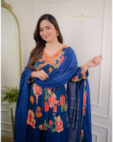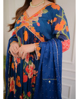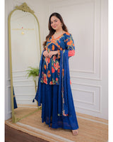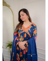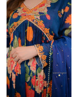 Featuring Navy Blue chinnon peplum with orange resham dori work with petal leaves motif, highlighted with sequins, moti, thread work and lining!