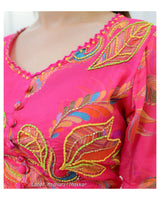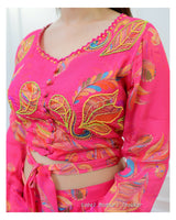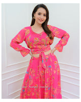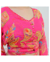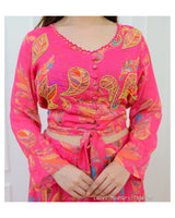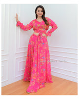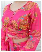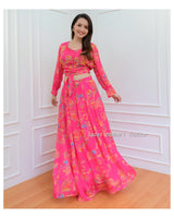 Take a deep dive into beautiful minimalism with these crop top paired with flared skirt. The crop top has all-over embroidery, knot tassels and print detailing.