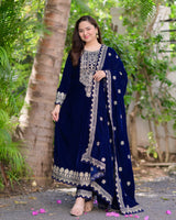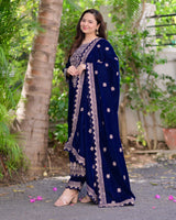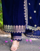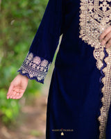 The most luxurious of them all, the all time favorite - Velvet pieces are here to stay this season. Featuring Navy Blue and Rani Pink Golden Thread Embroidered Suit Sets seamlessly blends tradition with modernity.