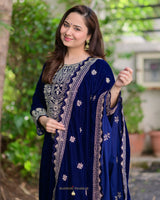 Adorned with intricate handwork on luscious velvet, this kurta is an indispensable addition for those in pursuit of a timeless festive wardrobe. It is paired with matching pants and velvet embroidered dupatta.