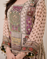 It is crafted with intricate hand embroidery and patch prints all over. It is paired with matching pants and chiffon dupatta. It comes with lining.