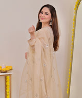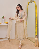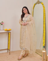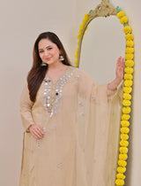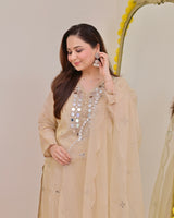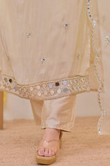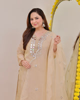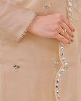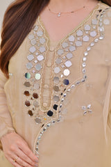 Wrapped in the elegance of premium Shimmer Tissue Suits adorned with intricate real mirror embroidery. The delicate handwork sparkles subtly under the light, while the silhouette offers unmatched comfort and charm.