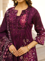 Crafted in soft breathable cotton, this beautiful Bandhani A-line suit is designed to bring comfort and grace to your everyday wardrobe. Adorned with the finest sequin highlights and delicate pintex detailing, the outfit reflects the timeless charm of traditional Bandhani prints while keeping the silhouette modern and effortless.