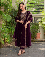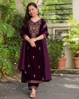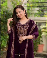 The most luxurious of them all, the all time favorite - Velvet pieces are here to stay this season. Featuring Magenta Zardozi Thread & Mirror Embroidered Suit Set seamlessly blends tradition with modernity.