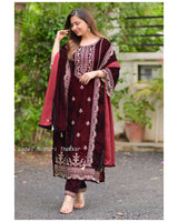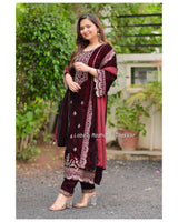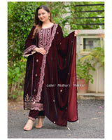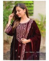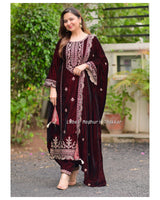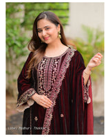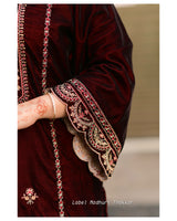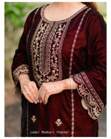The most luxurious of them all, the all time favorite - Velvet pieces are here to stay this season. Featuring Maroon - Brown Zardozi Thread & Cutdana Embroidered Suit Set seamlessly blends tradition with modernity.