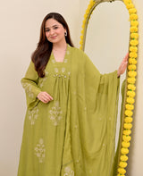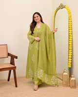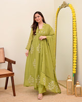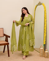 Olive Bloom Threadwork Mul Chanderi A Line Suit