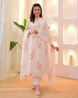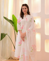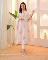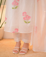 A blend of tradition, modernity and comfort. Tradition and style in perfect harmony. It is paired with schiffli palazzo pants and digital printed cotton dupatta.