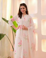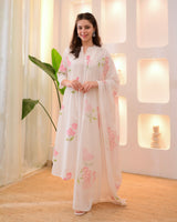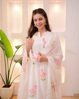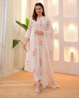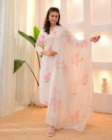Wrap yourself in elegance this Festive Season with our Pastels Schiffli Floral Anarkali Suit Set, featuring intricate Schiffli, thread embroidery all over and mirror accents. It Perfect for celebrating any upcoming festivities.