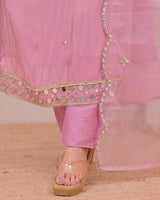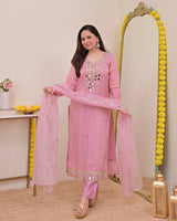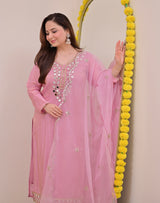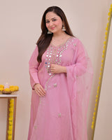 Wrapped in the elegance of premium Shimmer Tissue Suits adorned with intricate real mirror embroidery. The delicate handwork sparkles subtly under the light, while the silhouette offers unmatched comfort and charm.