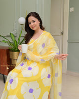 The printed abstract floral motif adorns the pleated kurta, accentuated by a rounded hemline, lace and versatile 3/4th sleeves. Functionality meets fashion with the inclusion of pockets in the kurta. The pants, ensure both comfort and style. It is paired with pure organza floral printed dupatta with lace.