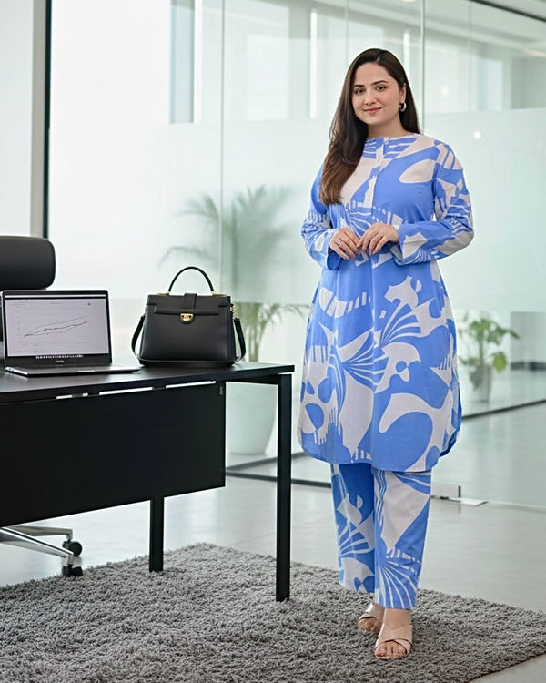 Sky Blue Ivory Floral Bouquet A Line Premium Cotton Co-ord Set
