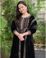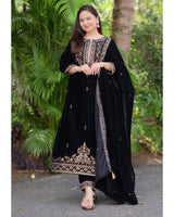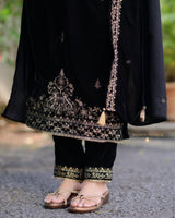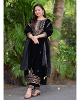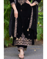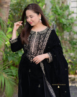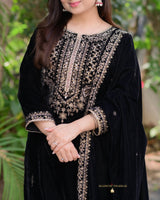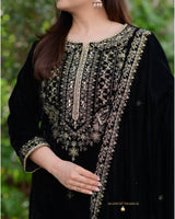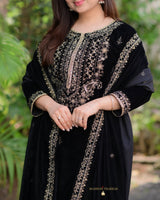 The most luxurious of them all, the all time favorite - Velvet pieces are here to stay this season. Featuring Black Zardozi Thread & Mirror Embroidered Suit Set seamlessly blends tradition with modernity.