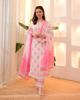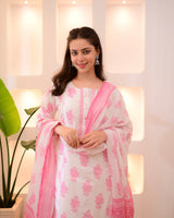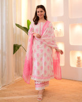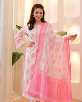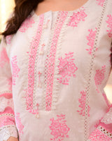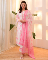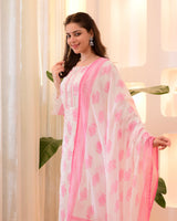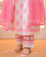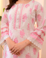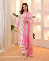 Comes with coordinated cotton pants featuring lace accents and a matching printed dupatta, creating a cohesive and graceful silhouette.