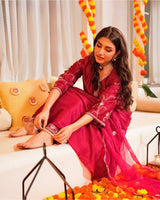 It is paired with matching comfort Pants and Dupatta adorned with embroidery.