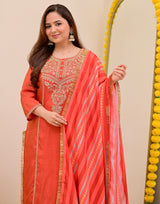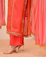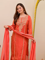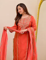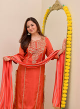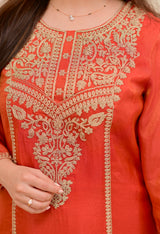 Crimson Orange Shimmer Tissue Handwork Festive Suit