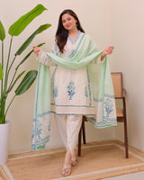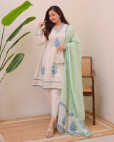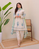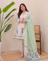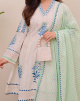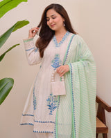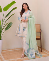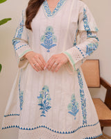 Elevate your everyday elegance with our premium cotton Pakistani suit, thoughtfully designed for comfort and style. This ensemble features a charming short A-line kurta adorned with the finest floral prints and intricate schiffli embroidery, adding a touch of timeless grace.