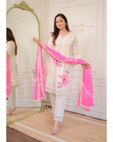 A perfect blend of elegance and style. It is paired with matching straight pants and tie - dye tassel dupatta. It comes with lining.