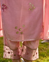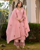 Crafted in pure Chanderi, this graceful ensemble celebrates timeless craftsmanship with a beautifully embroidered neckline and delicate floral motifs scattered across the kurta. Light, breathable and luxurious, Chanderi adds a subtle sheen that makes it perfect for both festive gatherings and elegant daytime occasions.