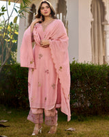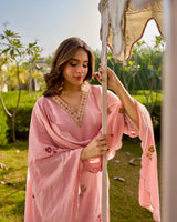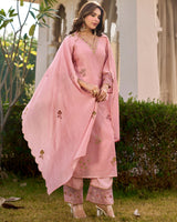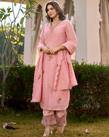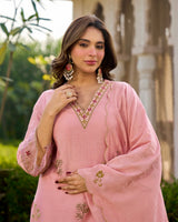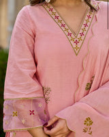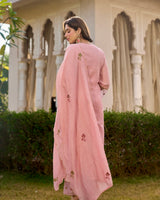 Paired with a Chanderi embroidered dupatta finished with scalloped edges, the set brings together softness, sophistication, and traditional charm. The intricate detailing adds just the right amount of festive sparkle while keeping the look refined and graceful.