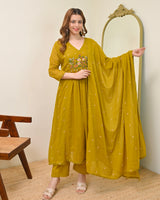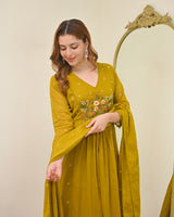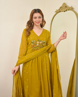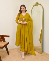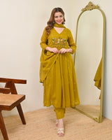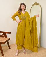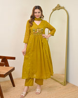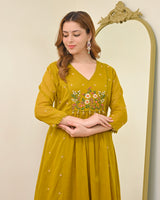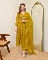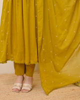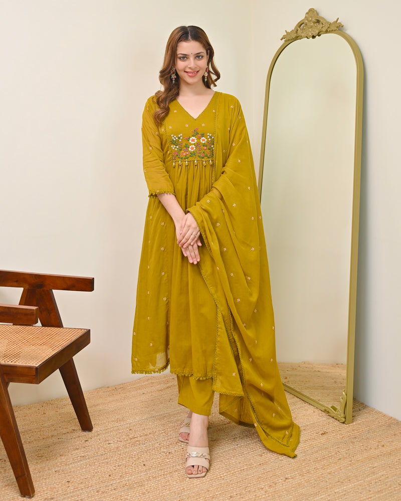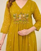 Mustard Meher Mul Cotton Threadwork A Line Suit