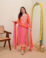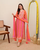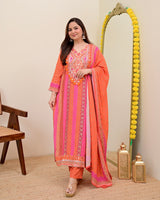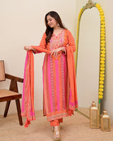 The dupatta flows like a breeze, adding charm to every movement, while the festive color palette makes it perfect for intimate festive gatherings, daytime celebrations, and everything in between. Comes with front lining.