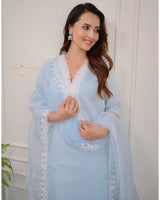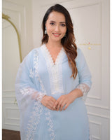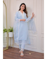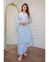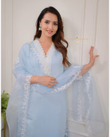 It is paired with matching pants and Organza thread embroidered dupatta.