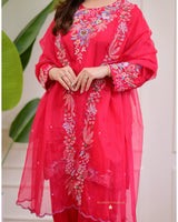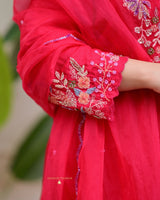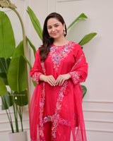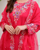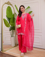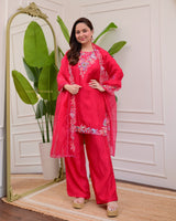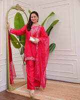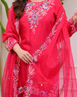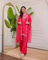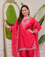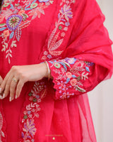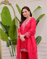 Featuring beautifully Crafted Silk Short Kurta Suit in beautiful Rani Pink Colour, which is decorated with finest Hand Embroidery Work. A Must Have for upcoming Festivities! It is paired with matching pants and Organza scallop work dupatta.