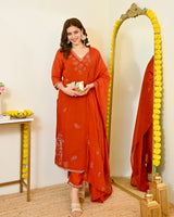 Where elegance meets legacy. Featuring this beautiful Pure Mul Chanderi Suit which is elevated with fine hand embroidery, paired matching pant and an intricately embroidered dupatta.