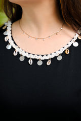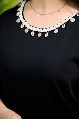 Delicate shell embellishments on the neckline, adding just the right touch of sparkle—subtle, sophisticated, and oh-so-classy.
