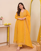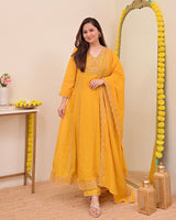 Featuring Beautiful Premium Mul Chanderi A-line Suits which are crafted with finest hand embroidery. It is so light weighted and comfortable for your upcoming gatherings. It is paired with matching pants and embroidered dupatta. It comes with lining inside.